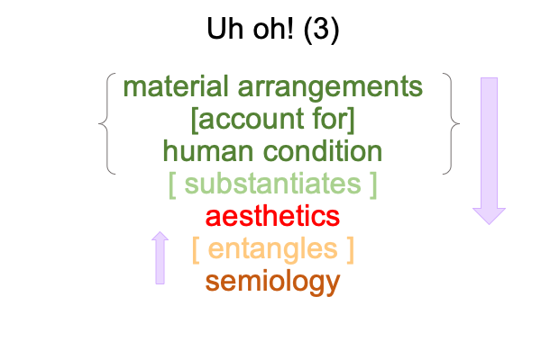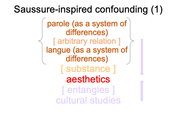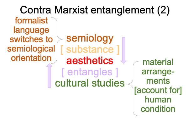 So, they adopt the intellectual tools-at-hand, including Saussure’s semiology and its cohort, structuralism.  Structuralism is a thing, where {semiology as matter [substantiates] aesthetics as form}.  The problem, of course, is that aesthetics as form entangles the Marxist thing as matter. The Marxist thing?  Material arrangements as matter [substantiate] human conditions as form.