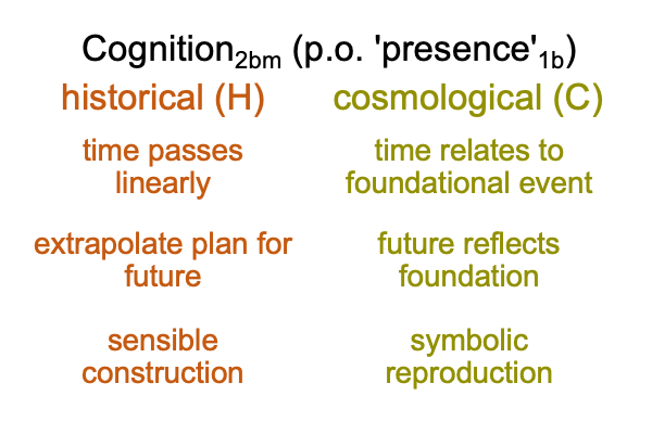 On the situation level, the normal context of prognostication3b brings the dyadic actuality, {the coming future2bm[substantiates] continued continuity2bf}, into relation with the possibility of ‘the presence of both historical and cosmological time’1b.