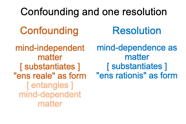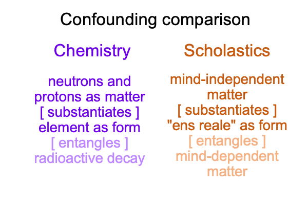 0968 Here is a comparison of the two entangled things. For chemistry, an isotopic thing (the nucleus, at least) gets entangled in the matter of radioactive instability. For the medieval scholastics, a mind-independent being ends up entangled with mind-dependent matter.