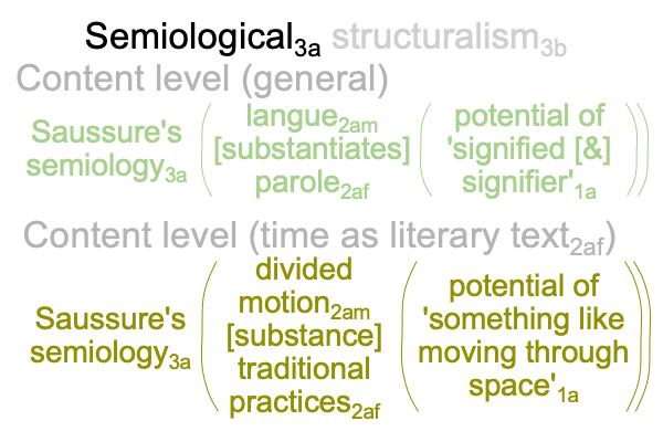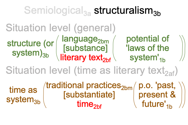 0655 So, the Tartu-Moscow School of Semiotics builds on the semiology3a and structuralism3b inherent in Saussure’s tradition, while the literary texts2bf speak for themselves. They speak through hylomorphism and entanglement, through normal contexts and potentials, without providing labels for their language2bm and without scientifically translating their voices into a language2am designed to label meaning1a, presence1b and message1c.
