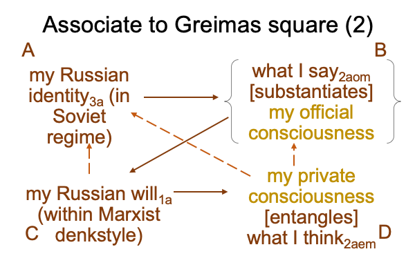 Obviously, there is a problem with previous associations to the Greimas square, where my (Russian) truth1a (D) contrasts with my (Russian) will1a (C), contradicts my Russian identity3a (A) and complements the dyadic actuality of {what I think2am [substantiates] what I say2af} (B).
