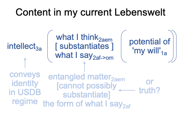 0802 Right now, my American will1a (which underlies my intellect3a) (C) speaks against what I say as matter2aom and my official consciousness as form (B). My American will1a (C) complements my American identity3a (in the USDBregime) (A) and, in doing so, partially accounts for the joke in point 0046.