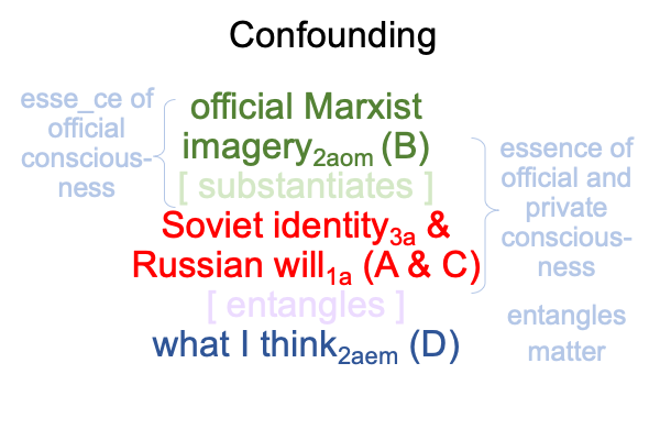 0807 Indeed, the dyad of {my voice2aom [substantiating] my official consciousness2af} (B) depicts the “mental geography of the Soviet regime”, that substantiates Soviet… er… Russian identity3a (A) and Russian will1a (C). In effect, B is official Marxist imagery2aom.