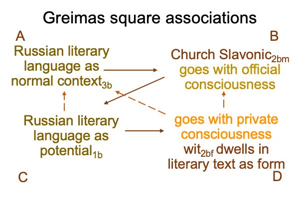 Boris Uspenskij describes this phenomenon, where Church Slavonic language2a (which would go with B) substantiates Russian literary languagebm (which would go with both A (Orthodox identity3a) and C (Russian will1a)) and entangles Russian wit2aem (which goes with D). If the literary text2bf is synonymous with wit2a (what I think2aom D), then Russian civilization is much more… um… hilarious than western Europeans are willing to admit.
