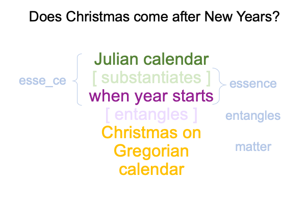 0810 The author provides several examples, one of which is the practical business-oriented Julian calendar (which appeals to official consciousness) and the somewhat off-kilter theology-oriented Gregorian calendar (which appeals to private consciousness), leading to questions about whether one can celebrate New Years if it comes before Christmas.