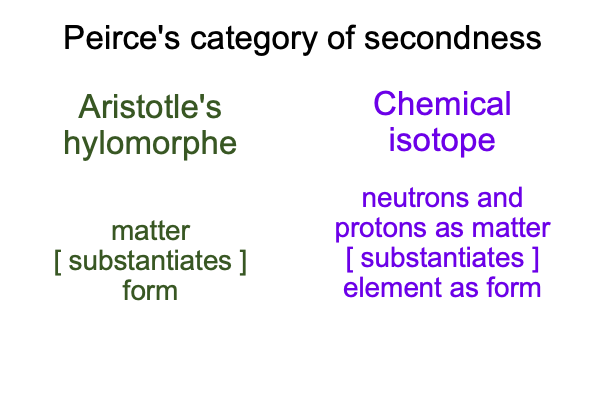 0957 Peirce’s category of secondness consists of two contiguous real elements. For Aristotle’s hylomorphe, the real elements are matter and form. The contiguity, placed in brackets for proper notation, is [substance] or [substantiates]. Either noun or verb is appropriate, because the contiguity can be construed as either.