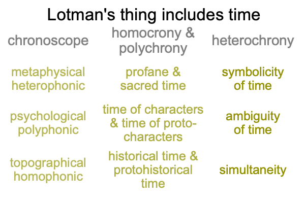 1095 The way that Lotman’s thing includes time shows how Torop’s tables2af entangle a language2am of presence1b (as well as meaning1a). Lotman recognizes2bm time2af as a formal requirement of the chronotope2am and forces Torop to construct his own table (Figure 4 on page 330) as a way to situate2bf that entanglement2a.