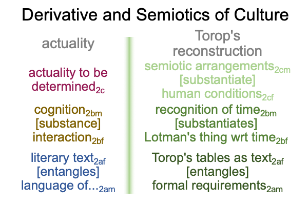 1099 For Torop’s table addressing Lotman (Figure 4), the perspective-level actuality2c of {semiotic arrangements2cm[substantiate] human conditions2cf} virtually brings the situation-level actuality of {Lotman’s recognition of time2bm[substantiates] Lotman’s thing with respect to time (as a three-level table)2bf} into relation with the content-level possibility that {Torop’s tables as text2af [entangle] the chronotope’s formal requirements2am of the normal context of the Tartu-Moscow School3a}.