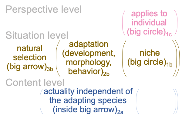 The normal context of natural selection3b brings the actuality of individual adaptations (in development, morphology and behavior)2b into relation with a niche1b, where the niche is defined as the potential of ‘something ecological’1b.