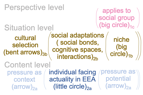 0138 The normal context of cultural selection3b brings the actuality of social adaptations (including social bonds, cognitive spaces and cooperative interactions)2b into relation with a social niche1b, defined as the potential1b of individuals facing natural selection pressures in the environment of evolutionary adaptation (EEA)2a.