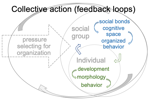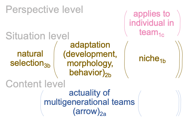 0140 Next, imagine that the salient social circle is the team (15). Over generations, the team1c encourages social adaptations2b that rewards individuals with phenotypes that are appropriate to that team2a. In other words, successful teams2a, as the medium responding to evolutionary pressures associated with obligating collaborative foraging,produces a selection pressure3b on the individual2b.