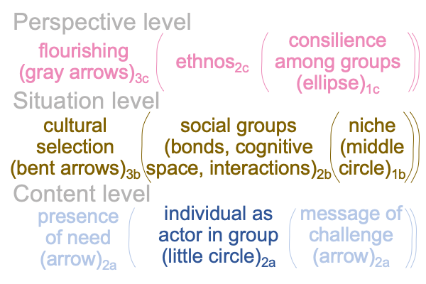 On the perspective level, the normal context of hominin flourishing3c brings the actuality of the ethnos2c into relation with the potential of harmony among all social circles, including those smaller and larger than the community1c.