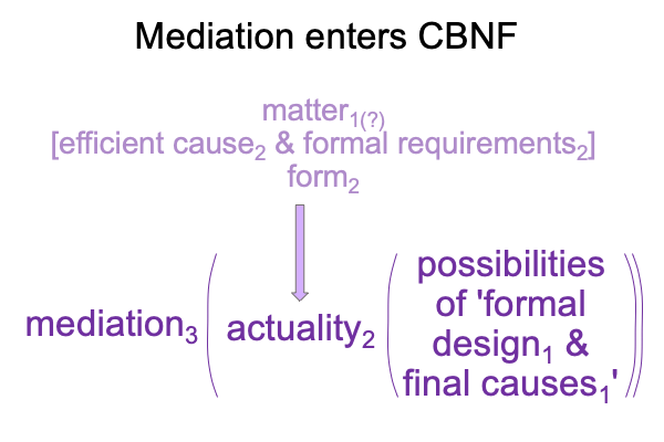 Mediation3 becomes the normal context3. The formal design1 and final attributes1 go into potential1. Matter1(?)substantiates form2. The substance contains efficient causes2 and formal requirements2.