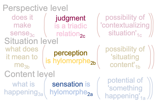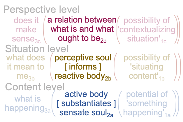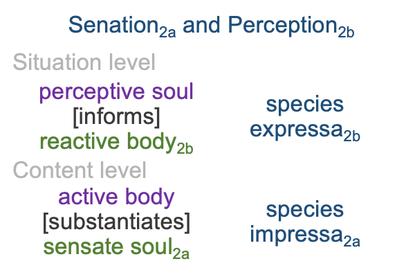 The soul2 is sensatea form on the content level and perceptiveb matter on the situation level. The sensate soul2a exhibits qualia and feelings. The perceptive soul2b emerges from (and situates) the possibility of one’s imagination1b.