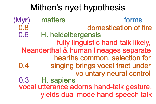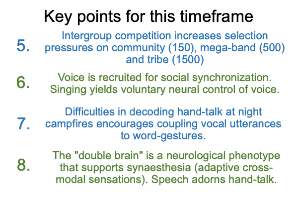 0382 Before the evolution of Homo sapiens, day-talk and night-talk are distinct traditions that encourage story-telling. Hearths are common by 400kyr. Night-time hand-talk with a campfire as illumination presents challenges. So, traditions arise where a vocal utterance accompanies each hand-talk word gesture.