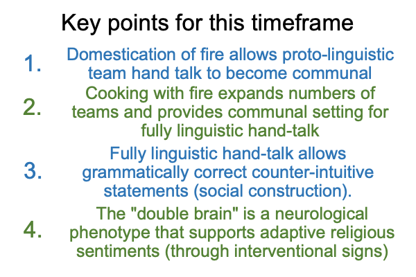 0372 The following figure covers from the the start of the domestication of fire (at 0.8Myr) until the earliest appearance of Homo sapiens (at, say, 0.3Myr). This corresponds to the third period of human evolution (using Tomasello’s nomenclature). This is also where Steven Mithen’s nyet hypothesis applies.