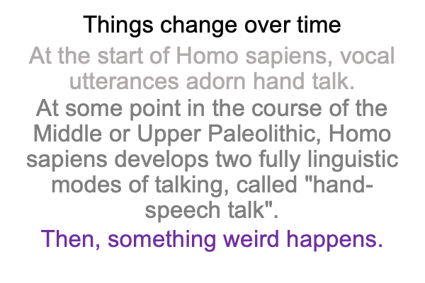 0417 By the time that humans in Eurasia are no longer interbreeding with Neanderthals and Denisovans, they practice hand-speech talk as a dual-mode way of talking. Speech is no longer merely an adornment to hand talk. Speech has taken a life of its own.