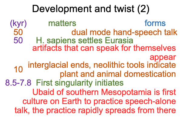 0427 When the current interglacial begins, the oceans rise as glaciers melt. The rise is so significant that the Persian Gulf fills. Twelve-thousand years ago, the Persian Gulf is a dry valley with a river gorge, home to two late-stone-age hand-speech-talking cultures, one Neolithic dryland farming and stockbreeding on the valley floor and one Mesolithic coast-dwelling and wetland-familiar in the river gorge. The rise of the sea level drives them to the edges of the Persian Gulf. The two hand-speech cultures become one speech-alone talking culture, the Ubaid of southern Mesopotamia.