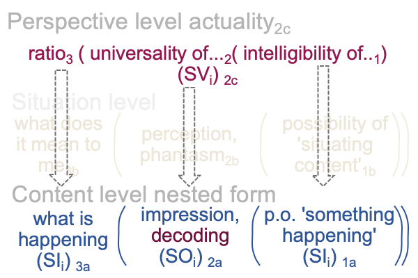 In Latin, the second resonance is between species impressa intelligibilis2(2c) and species impressa2a. The plainness of the Latin assists, because each of these terms must be regarded holistically. In English, scientific terminology elaborates further distinctions and wholeness is veiled. For example, for the perspective-level actuality2c, the Latin term, intelligibilis, translates as “universality”. Also, species impressa2a is captured by three distinct terms: sensation, impression and decoding.