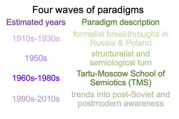 So, during the third paradigm-wave, collaborators in the Tartu-Moscow School propose research projects aiming to expand linguistic and semiotic methods into literary and cultural theory2b. Vigorous debate follows. The authors do not say what really happened.