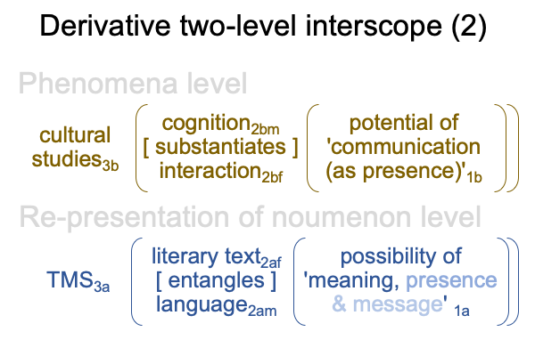 0225 On the content (or presentation of “the model as the noumenon” level), the triadic normal context of the positivist intellect of the Tartu-Moscow School3a brings the dyadic actuality, {literary text (as form) [entangles] language (as matter)}2a into relation with the potential of ‘meaning1a, presence1b and message1c‘.