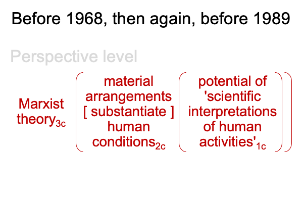 0248 In the triadic normal context of Marxist theory3c, the dyadic actuality of {material arrangements [substantiate] human conditions}2c emerges from (and situates) the potential of ‘scientific interpretations of human activities’1c.