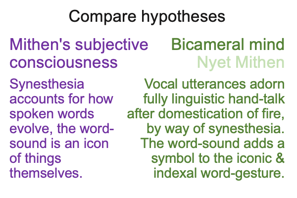 Mithen’s bicameral mind asks, “If we currently practice speech-alone talk and if the gestural origins of language makes sense, then how does speech get added to fully linguistic hand-talk in human evolution?”