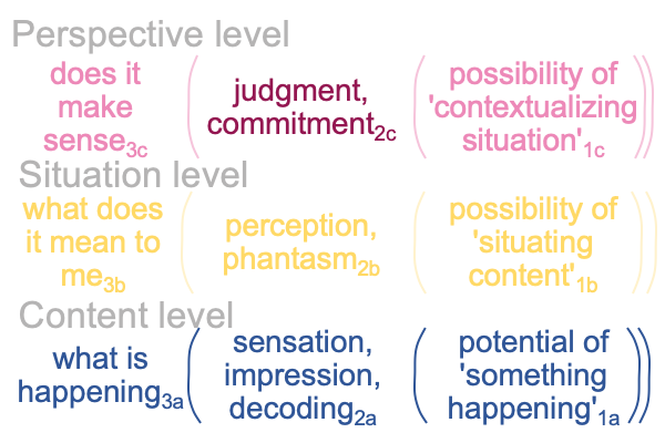 The entire inferior category-based nested form manifests the contenta level for the same scholastic interscope.  The normal context of what is happening3a brings the actuality of a kind of impression (in Latin, a species impressa2a) which includes decoding, as well as sensory information and feelings, into relation with the possibility of ‘something happening’1a.