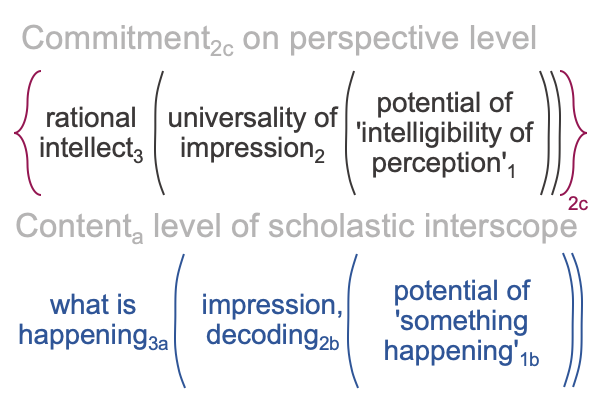 According to the scholastic ideal, commitment2c is a category-based nested form where the normal context of rationes3(2c) brings the actuality of a species impressa intelligibilis2(2c) into relation with the possibility of a species expressa intelligibilis1(2c).