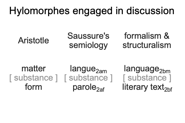 0170 On the content level, the normal context of Saussure’s sign paradigm3a brings the actuality of the hylomorphic dyad, {langue as matter2am [substantiates] parole as form2af}, into relation with the potential of ‘a signified [and] a signifier’1a.