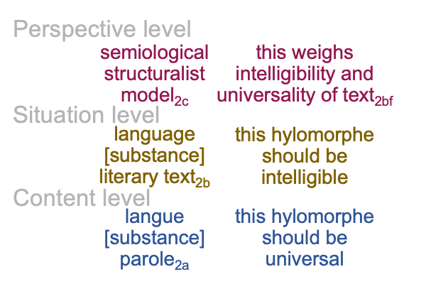 0190 The virtual normal context of a structuralist model2c brings the situation-level actuality of {language [substance] literary text}2b into relation with the potential of the content-level actuality of {langue [substance] parole}2a.