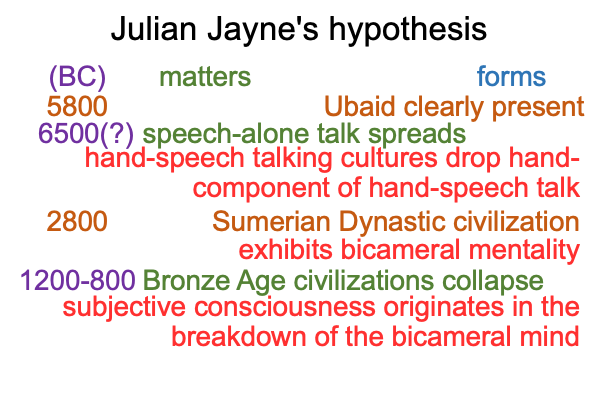 Indeed, the bicameral mind persists through the Sumerian Dynastic, long after writing is invented.
