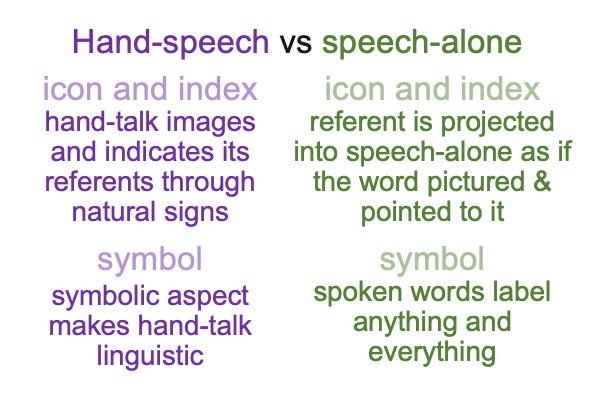 0438 The semiotics of hand-talk allows both sensible and social construction. Hand-talk images and indicates its referents. The referent precedes the manual-brachial word-gesture. Because hand-talk words are distinct, they behave like symbols. Symbols are different from one another. They form a symbolic order that allows symbolic operations, such as grammar. This is how hand-talk becomes fully linguistic.