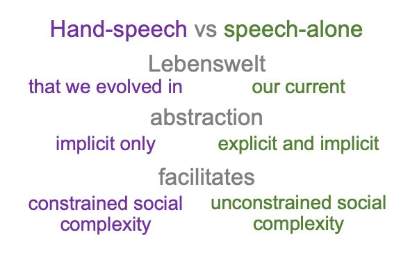 This is tricky, because spoken words appear to allow implicit abstraction and facilitate explicit abstraction. When the Wernicke’s region on the right adopts a spoken label as if it is a hand-talk word, then the person projects that assumption into the way an utterance is decoded. I suppose that might increase the intelligibility of perception2b in a specialized cultural venue, and if that is so, then speech-alone facilitates unconstrained social complexity. That does not mean harmony among social circles. It means the multiplication of explicit social circles based on specialized disciplinary languages and means of production.